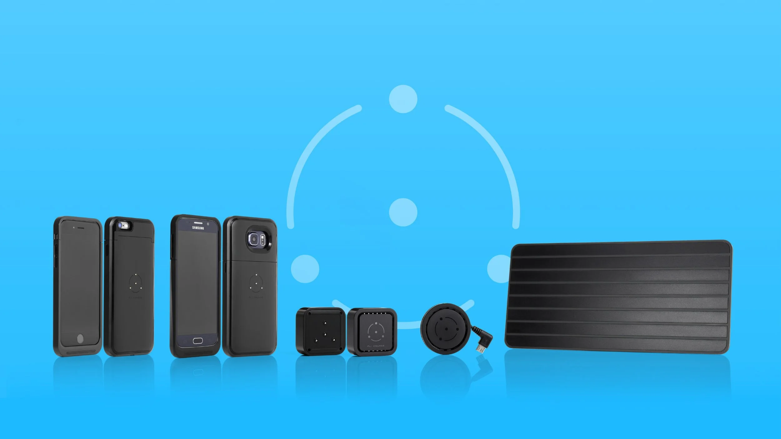 I designed the logo around the 4 dots that comprise the charging system. No matter how the 4 dots are oriented on the pad, at least 2 are touching the charging strips allowing for power transfer. This product suite served as a low-power showcase of the technology. The eventual goal for FLI Charge is to integrate their wire-free system into high-power industrial applications.